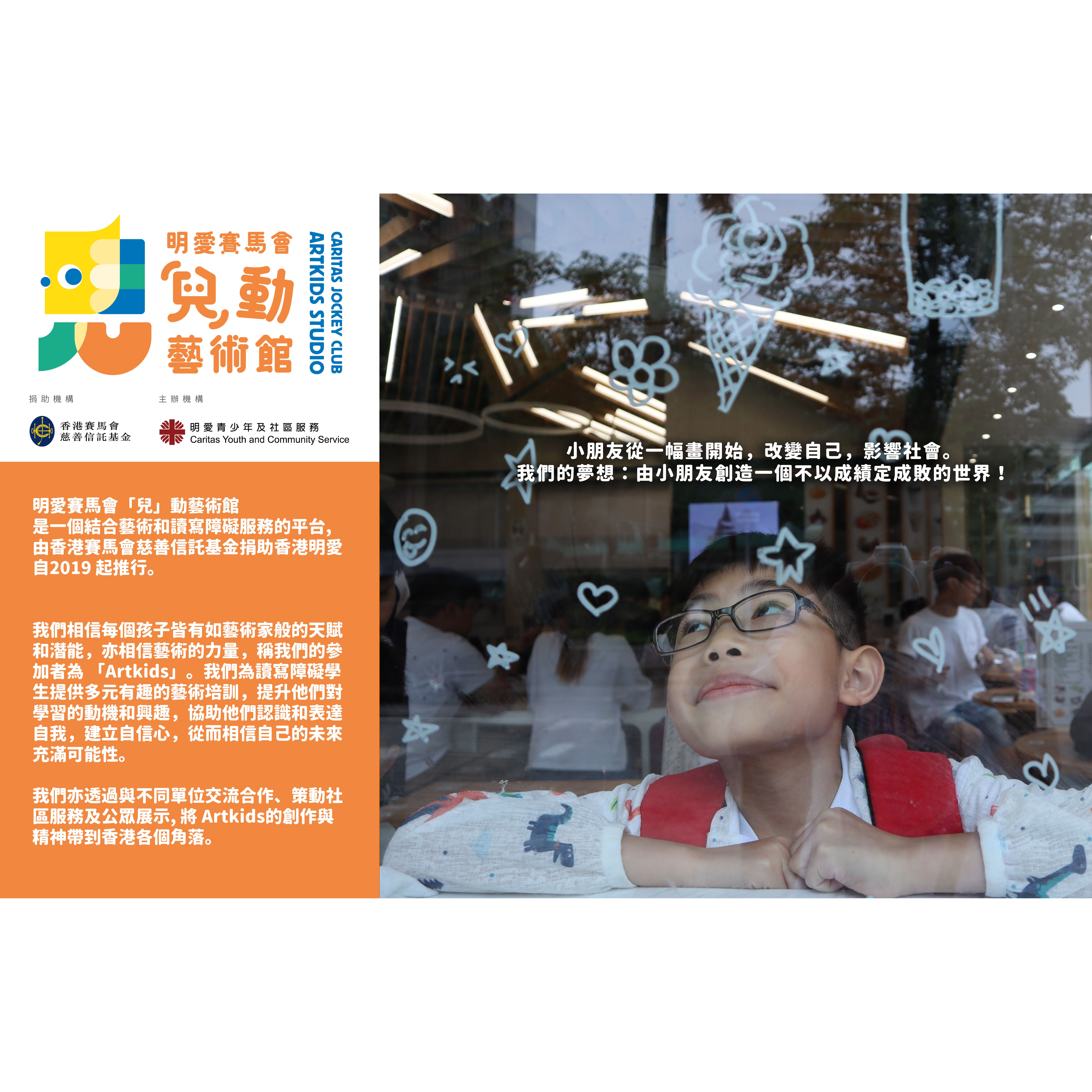 明愛賽馬會「兒」動藝術館 是一個結合藝術和讀寫障礙服務的平台, 由香港明愛於2018年創辦及香港賽馬會慈善信託基金捐助。他們相信每個孩子皆有無盡創意和潛能,亦相信藝術的力量,故為讀寫障礙小朋友提供專門的藝術課程,並以 「Artkids」命名參與計劃的孩子。