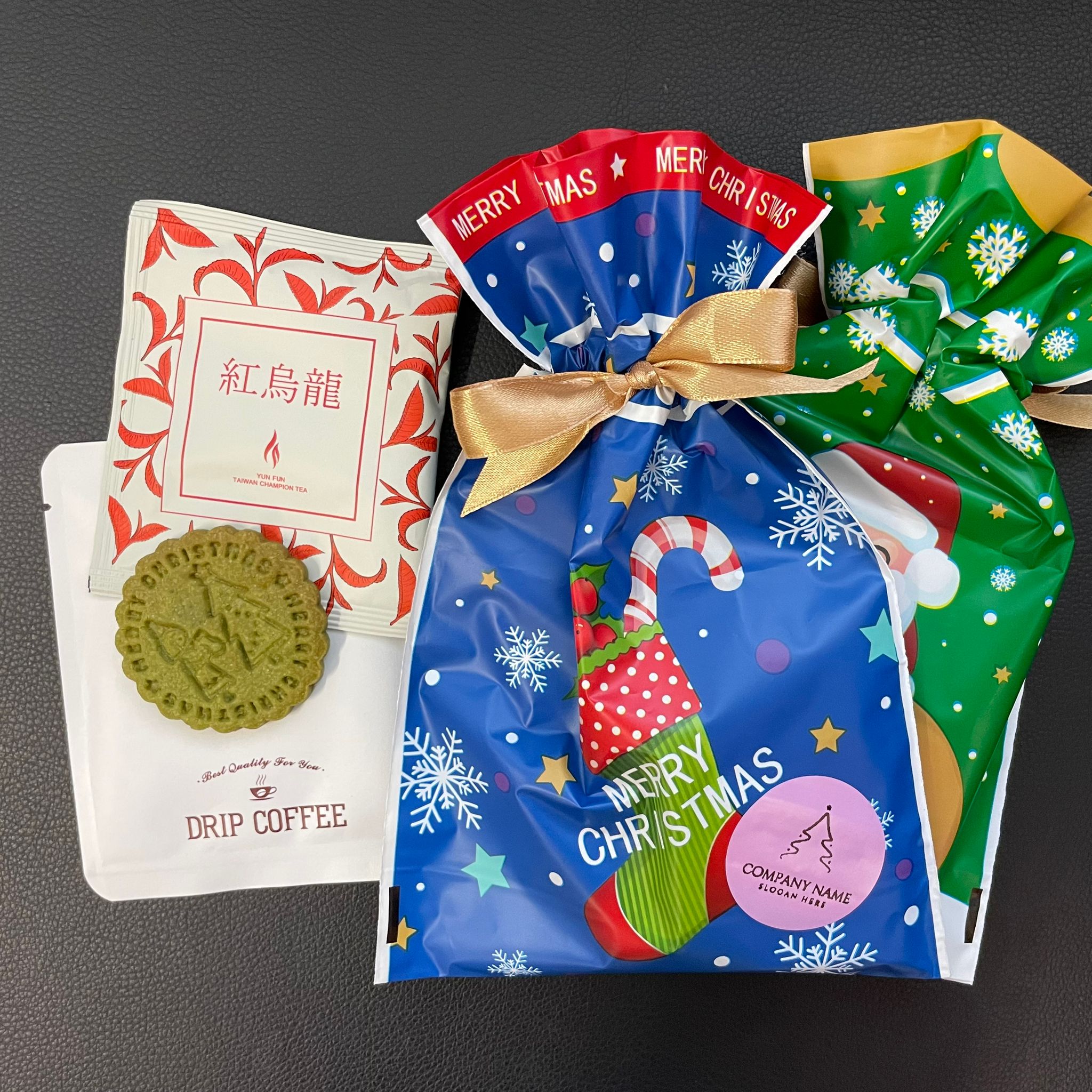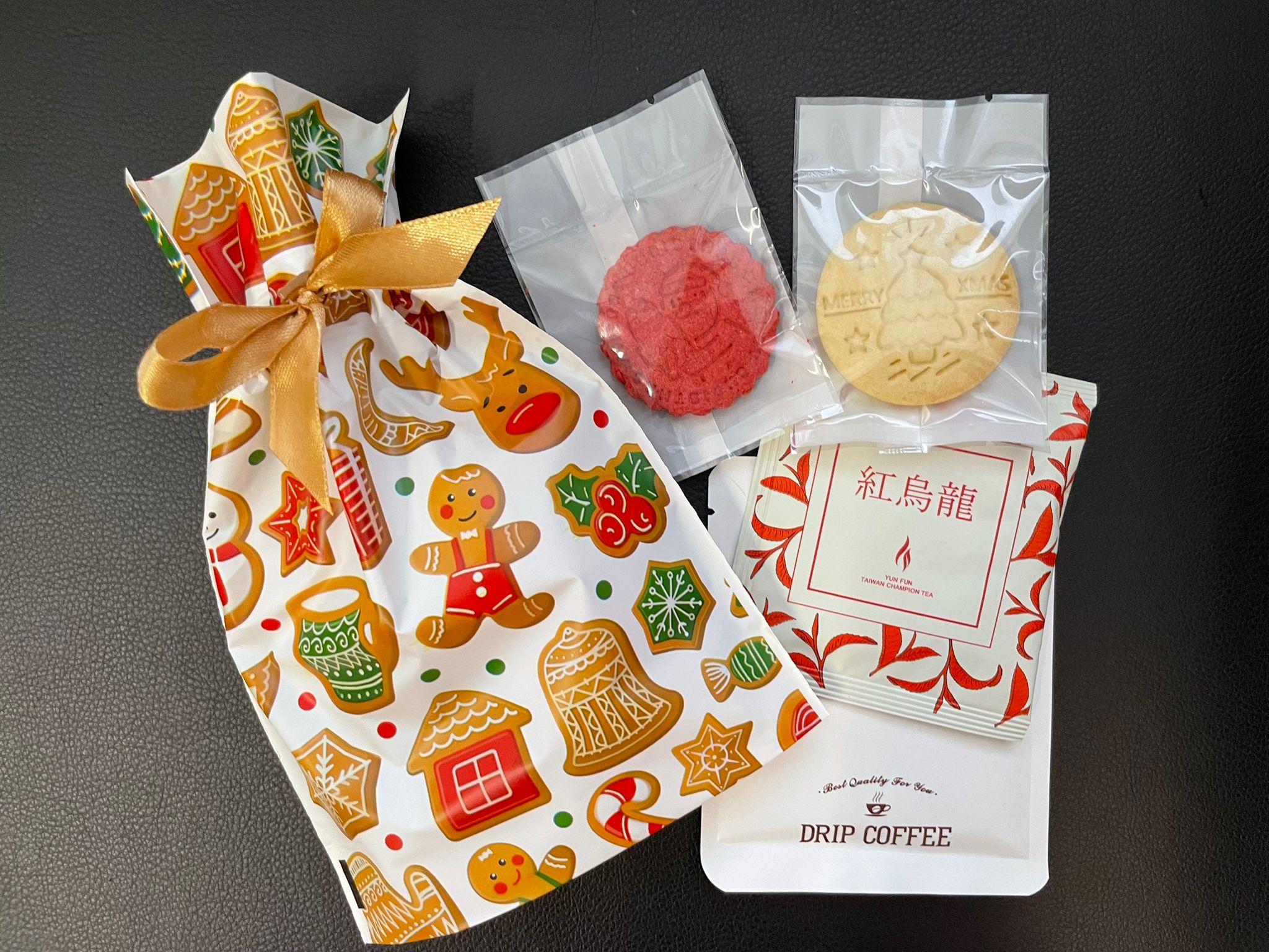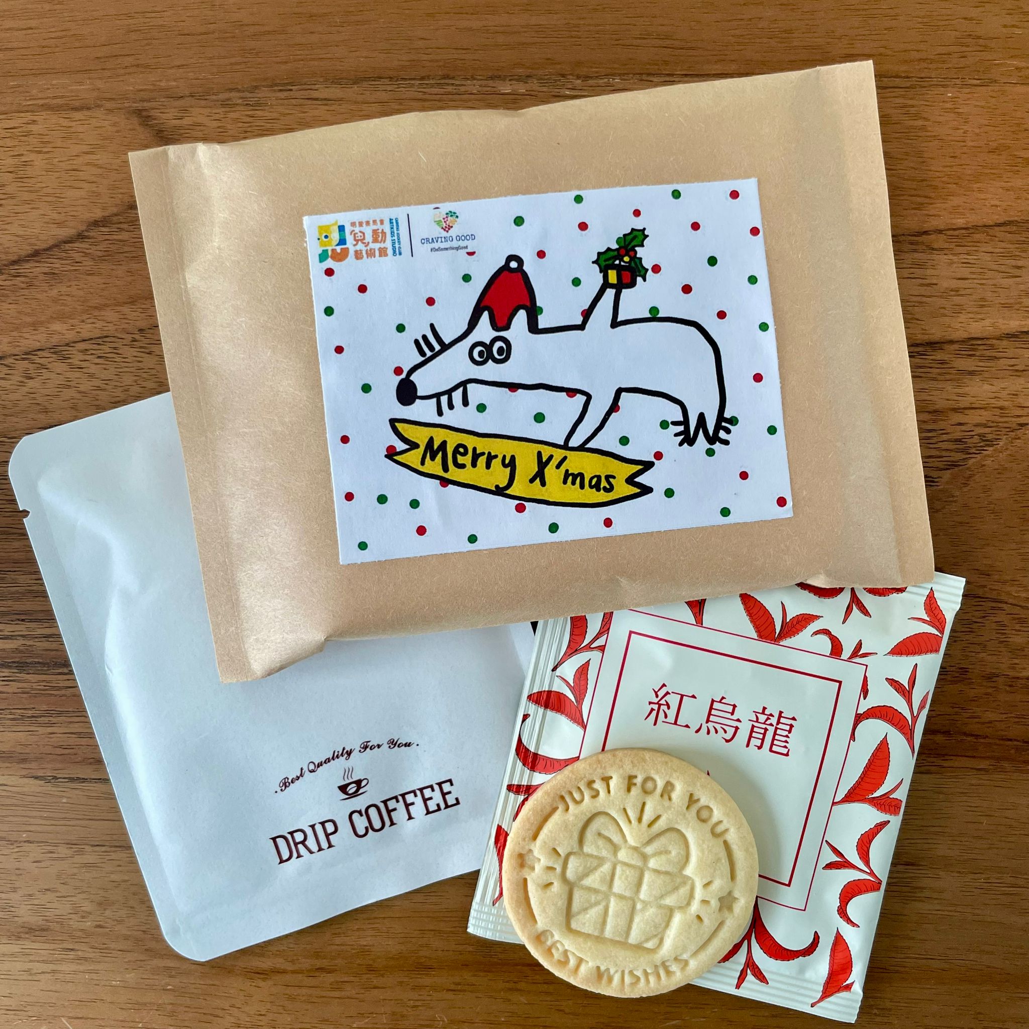 5.5cm-6cm直徑的🇭🇰香港本地製「Tiffany's Community Bakery」手工曲奇(註) 、🇲🇲緬甸公平貿易掛耳咖啡包、🇹🇼台灣台東高山允芳特選紅烏龍茶包,再配以精美聖誕包裝(多款包裝,隨機發貨)或 紙袋+Artkids設計聖誕貼紙,訂購超過100包更免費加送自選圖案貼紙。