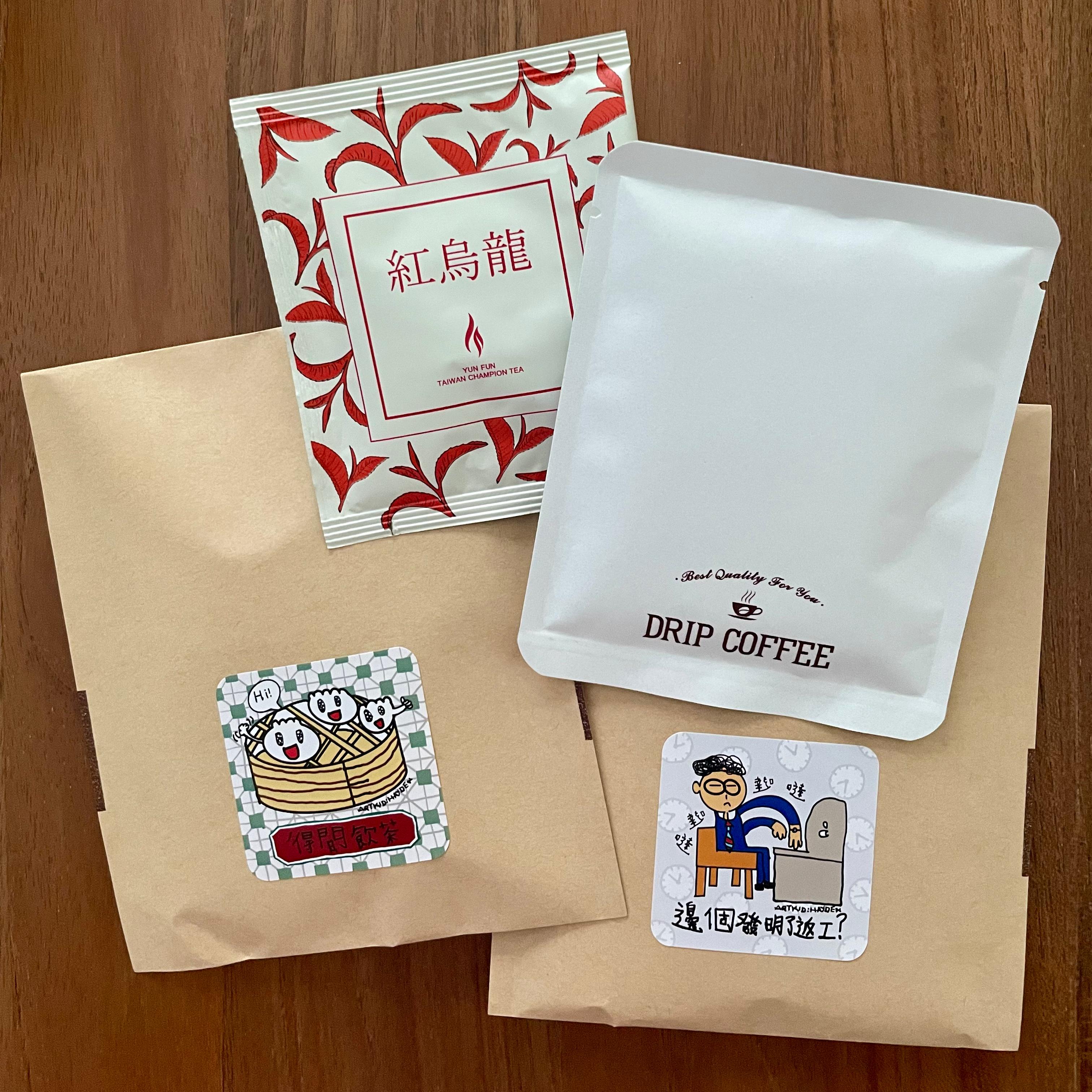 D. 【走先啦 - 散水茶啡套裝】每包散水禮物包括:1包台灣台東高山允芳特選紅烏龍茶包 + 1包緬甸公平貿易掛耳咖啡 + 精美包裝連自選Artkids 創意貼紙。每包HK$16