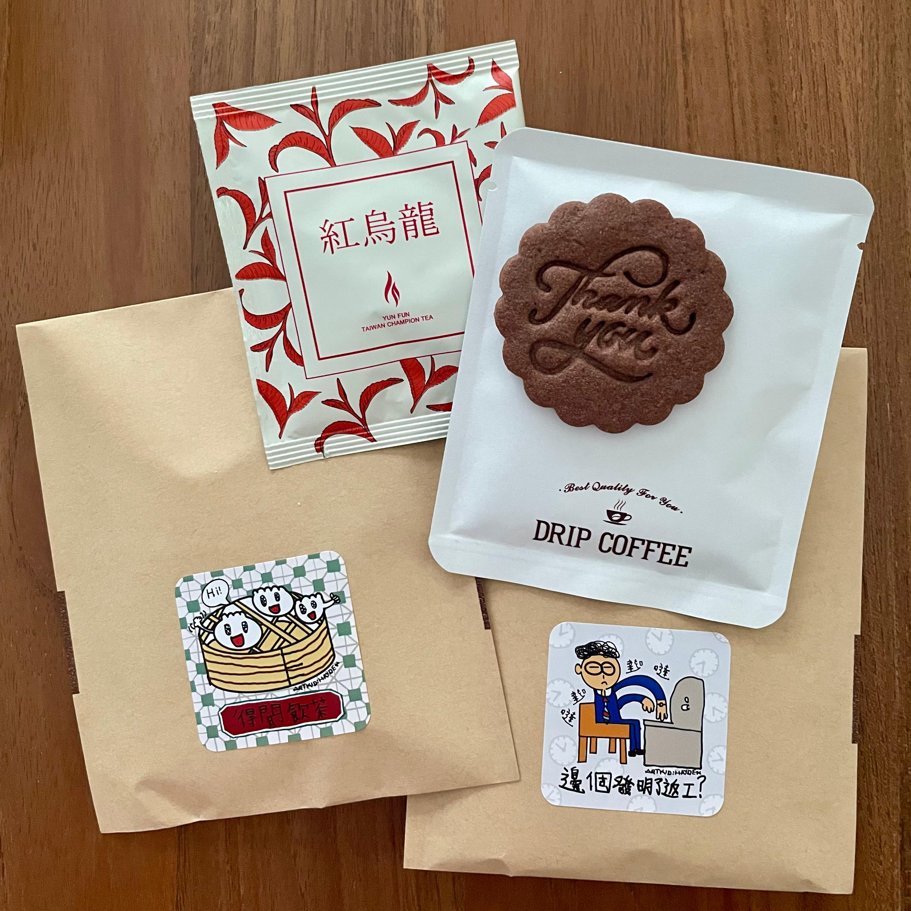 B. 【係咁先 - 手工曲奇套裝】每包散水禮物包括:2塊本地即訂即製「聰鳴茶座」純手工原味及朱古力杏仁曲奇各一 + 1包緬甸公平貿易掛耳咖啡 或 1包台灣台東高山允芳特選紅烏龍茶包 + 精美包裝連自選Artkids 創意貼紙。